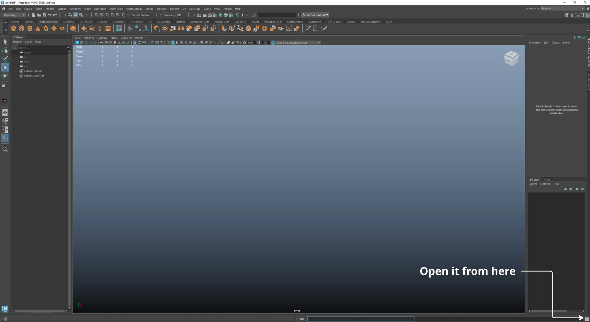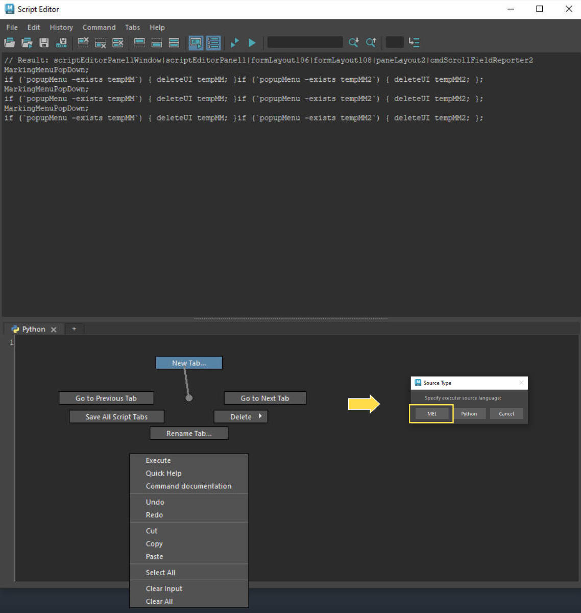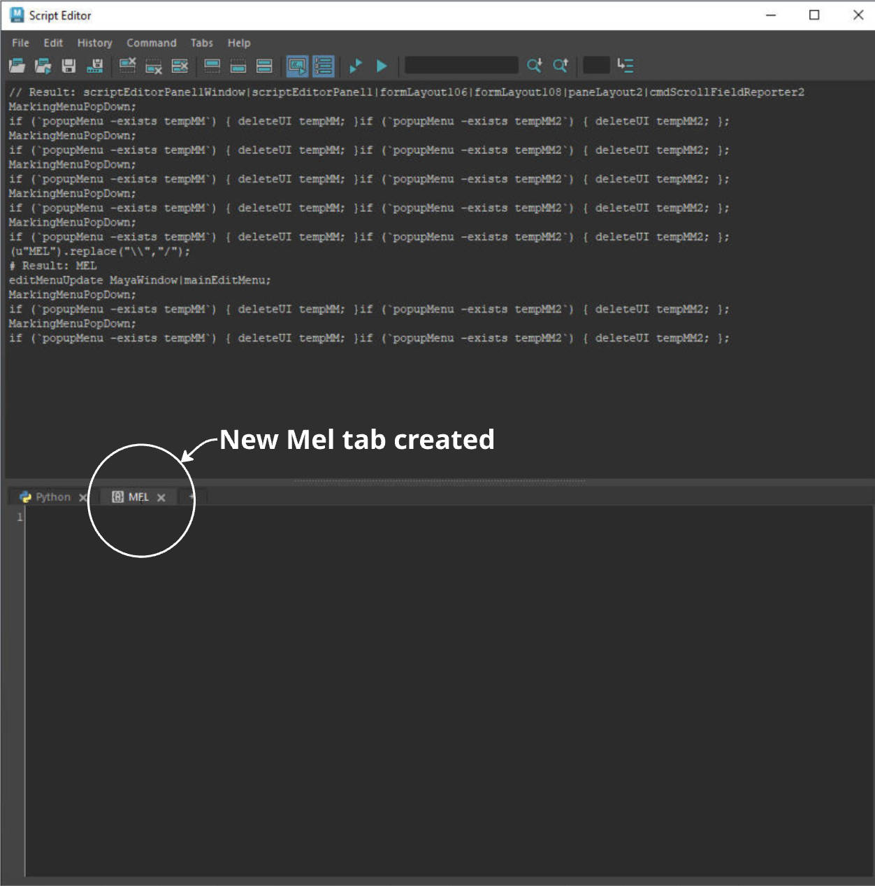 - Right Click on the bottom half section of the script editor and create a new Mel tab.